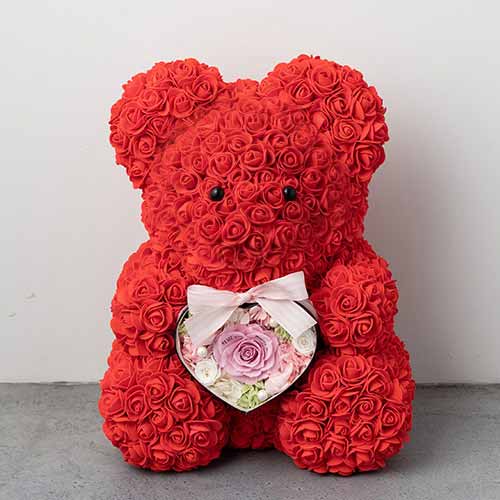 幸せを呼ぶローズテディベア抱っこハートアレンジメント ピンクころんとかわいいフォルムのテディーベアがハートボックスアレンジを抱えて新登場。花びらにメッセージを添えれるとベアがあなたの想いを伝えてくれます。