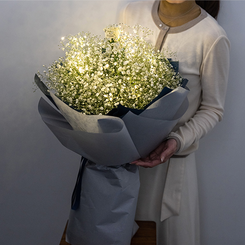 かすみ草の花束 光る星屑アレンジ Lサイズ彼女があっと驚く、満天の星々を集めたような、温かな光のかすみ草ブーケが登場しました。花言葉は「永遠の愛」。かすみ草と光が織りなすロマンティックな雰囲気で最高のプロポーズを